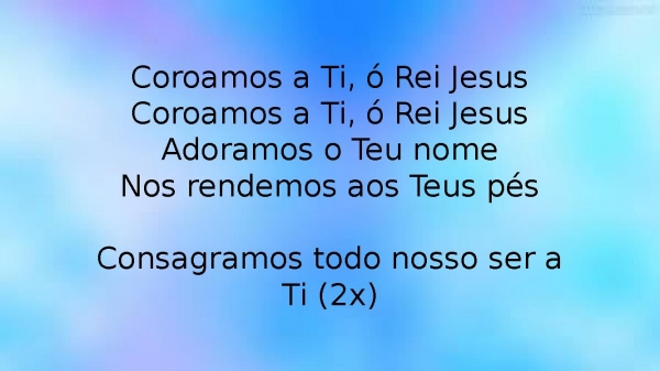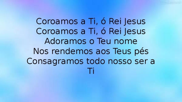 - Coroamos a Ti, ó Rei JesusCoroamos a Ti, ó Rei JesusAdoramos o Teu nomeNos rendemos aos Teus pésConsagramos todo nosso ser a Ti
