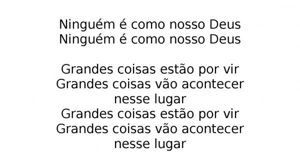 - Ninguém é como nosso DeusNinguém é como nosso DeusGrandes coisas estão por virGrandes coisas vão acontecer nesse lugarGrandes coisas estão por virGrandes coisas vão acontecer nesse lugar