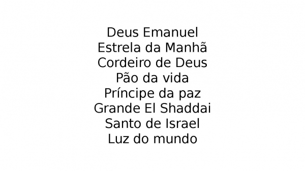 - Deus EmanuelEstrela da ManhãCordeiro de DeusPão da vidaPríncipe da pazGrande El ShaddaiSanto de IsraelLuz do mundo
