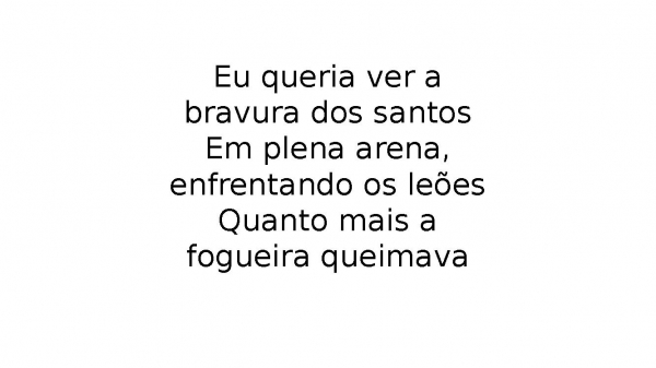 - Eu queria ver a bravura dos santosEm plena arena, enfrentando os leõesQuanto mais a fogueira queimava