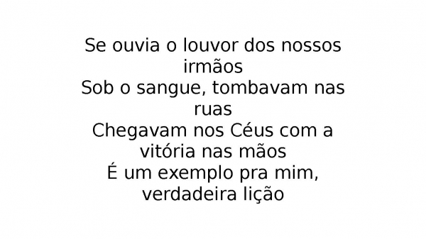 - Se ouvia o louvor dos nossos irmãosSob o sangue, tombavam nas ruasChegavam nos Céus com a vitória nas mãosÉ um exemplo pra mim, verdadeira lição