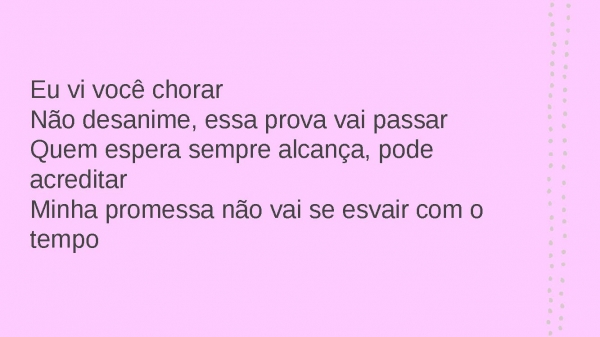 - Eu vi você chorarNão desanime, essa prova vai passarQuem espera sempre alcança, pode acreditarMinha promessa não vai se esvair com o tempo