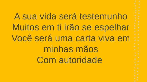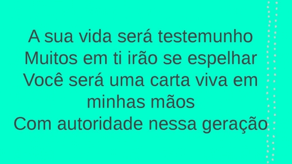 - A sua vida será testemunhoMuitos em ti irão se espelharVocê será uma carta viva em minhas mãosCom autoridade