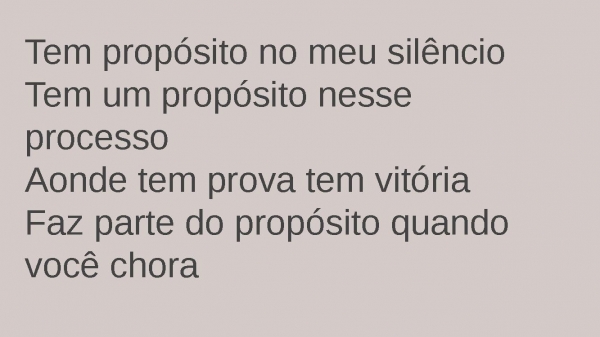 - Tem propósito no meu silêncioTem um propósito nesse processoAonde tem prova tem vitóriaFaz parte do propósito quando você chora