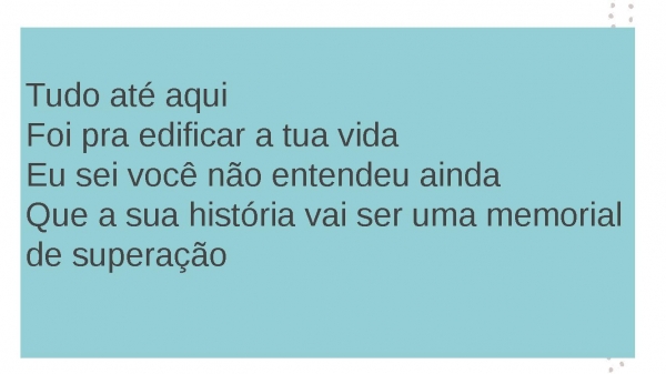 - Tudo até aquiFoi pra edificar a tua vidaEu sei você não entendeu aindaQue a sua história vai ser uma memorial de superação