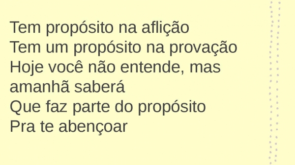 - Tem propósito na afliçãoTem um propósito na provaçãoHoje você não entende, mas amanhã saberáQue faz parte do propósitoPra te abençoar