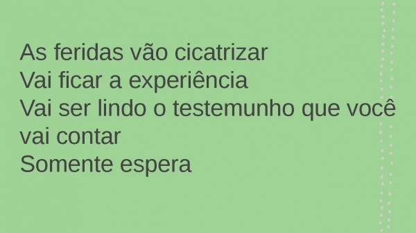 - As feridas vão cicatrizarVai ficar a experiênciaVai ser lindo o testemunho que você vai contarSomente espera