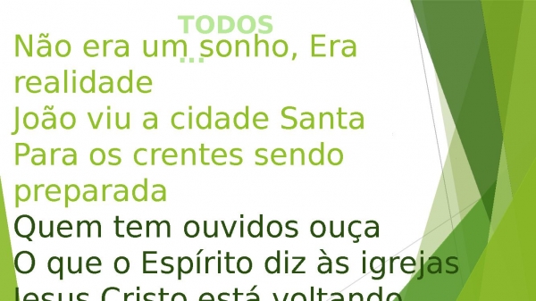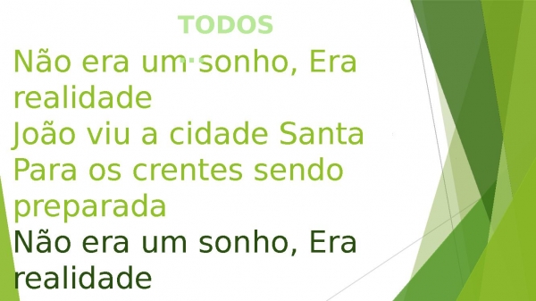 - Não era um sonho, Era realidadeJoão viu a cidade SantaPara os crentes sendo preparadaNão era um sonho, Era realidadeJoão viu a cidade SantaPara os crentes sendo preparadaTODOS...