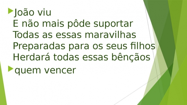 - João viuE não mais pôde suportarTodas as essas maravilhasPreparadas para os seus filhosHerdará todas essas bênçãos quem vencer