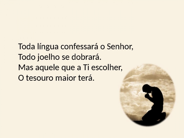 - Toda língua confessará o Senhor,Todo joelho se dobrará.Mas aquele que a Ti escolher,O tesouro maior terá.