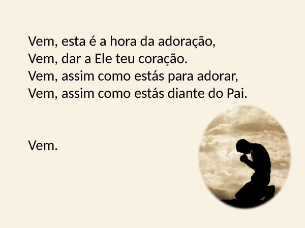 - Vem, esta é a hora da adoração,Vem, dar a Ele teu coração.Vem, assim como estás para adorar,Vem, assim como estás diante do Pai.Vem.