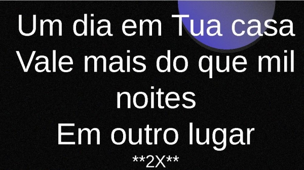 - UM DIA EM TUA CASAFERNANDINHOQuão maravilhoso é pra mimquão maravilhoso é pra mimviver em comunhãocom os meus irmãos todos os dias**2X**