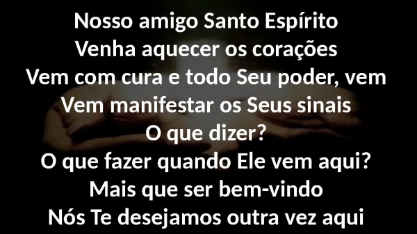 - Nosso amigo Santo EspíritoVenha aquecer os coraçõesVem com cura e todo Seu poder, vemVem manifestar os Seus sinaisO que dizer?O que fazer quando Ele vem aqui?Mais que ser bem-vindoNós Te desejamos outra vez aqui