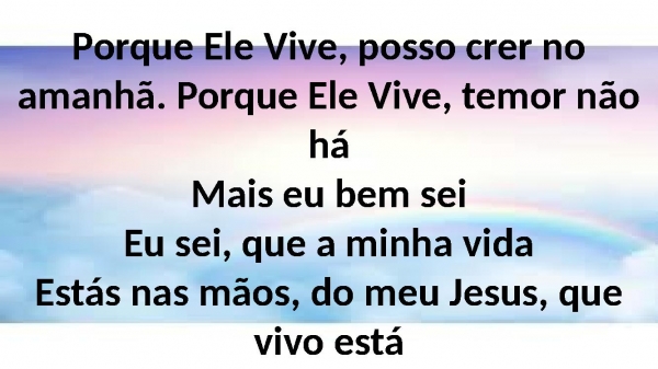 - Porque Ele Vive, posso crer no amanhã. Porque Ele Vive, temor não háMais eu bem seiEu sei, que a minha vidaEstás nas mãos, do meu Jesus, que vivo está