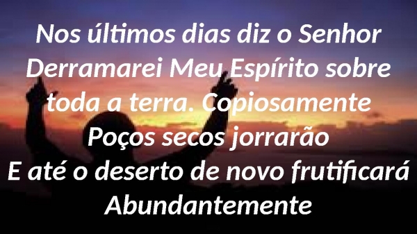 - Nos últimos dias diz o SenhorDerramarei Meu Espírito sobre toda a terra. CopiosamentePoços secos jorrarãoE até o deserto de novo frutificaráAbundantemente