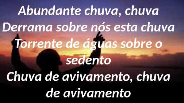 - Abundante chuva, chuvaDerrama sobre nós esta chuvaTorrente de águas sobre o sedentoChuva de avivamento, chuva de avivamento