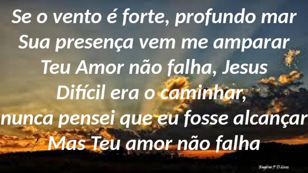 - Se o vento é forte, profundo marSua presença vem me ampararTeu Amor não falha, JesusDifícil era o caminhar, nunca pensei que eu fosse alcançarMas Teu amor não falha