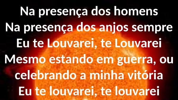 - Na presença dos homensNa presença dos anjos sempreEu te Louvarei, te LouvareiMesmo estando em guerra, ou celebrando a minha vitóriaEu te louvarei, te louvarei