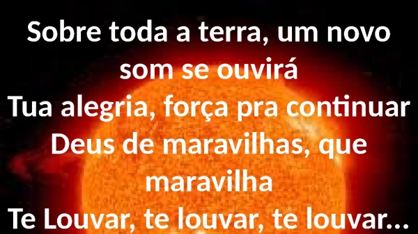- Sobre toda a terra, um novo som se ouviráTua alegria, força pra continuarDeus de maravilhas, que maravilhaTe Louvar, te louvar, te louvar...
