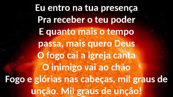 - Eu entro na tua presençaPra receber o teu poderE quanto mais o tempopassa, mais quero DeusO fogo cai a igreja cantaO inimigo vai ao chãoFogo e glórias nas cabeças, mil graus de unção. Mil graus de unção!