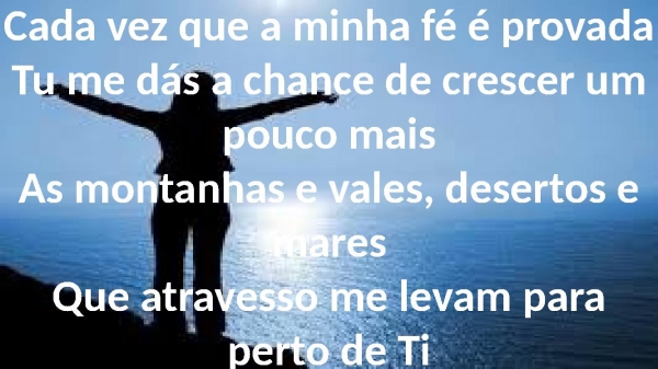 - Cada vez que a minha fé é provadaTu me dás a chance de crescer um pouco maisAs montanhas e vales, desertos e maresQue atravesso me levam para perto de Ti