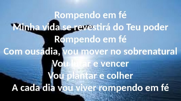 - Rompendo em féMinha vida se revestirá do Teu poderRompendo em féCom ousadia, vou mover no sobrenaturalVou lutar e vencerVou plantar e colherA cada dia vou viver rompendo em fé