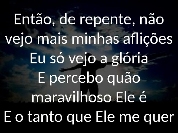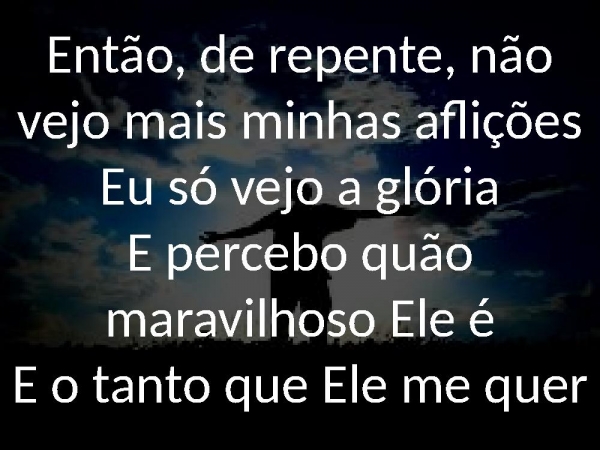 - Então, de repente, não vejo mais minhas afliçõesEu só vejo a glóriaE percebo quão maravilhoso Ele éE o tanto que Ele me quer
