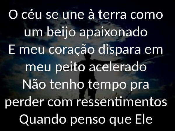 - O céu se une à terra como um beijo apaixonadoE meu coração dispara em meu peito aceleradoNão tenho tempo pra perder com ressentimentosQuando penso que Ele