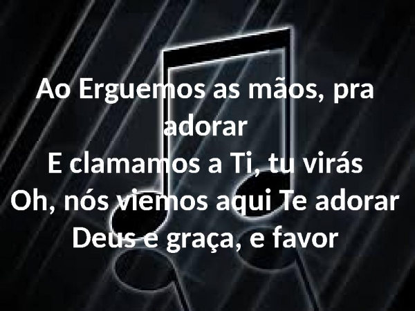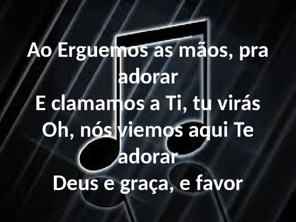 - Ao Erguemos as mãos, pra adorarE clamamos a Ti, tu virásOh, nós viemos aqui Te adorarDeus e graça, e favor