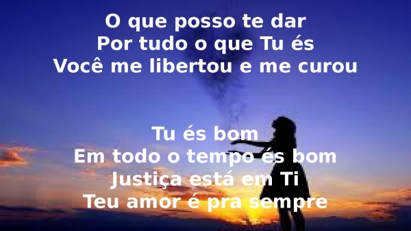 - O que posso te darPor tudo o que Tu ésVocê me libertou e me curouTu és bomEm todo o tempo és bomJustiça está em TiTeu amor é pra sempre