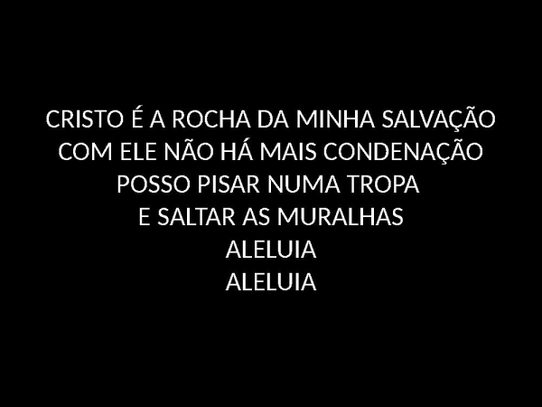 - CRISTO É A ROCHA DA MINHA SALVAÇÃOCOM ELE NÃO HÁ MAIS CONDENAÇÃOPOSSO PISAR NUMA TROPA E SALTAR AS MURALHASALELUIAALELUIA