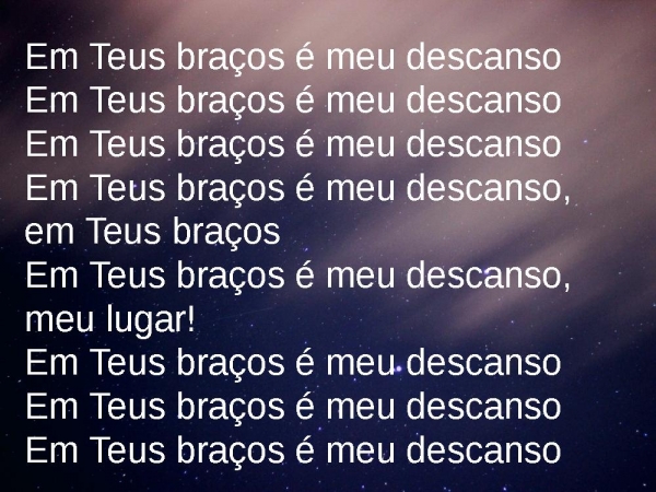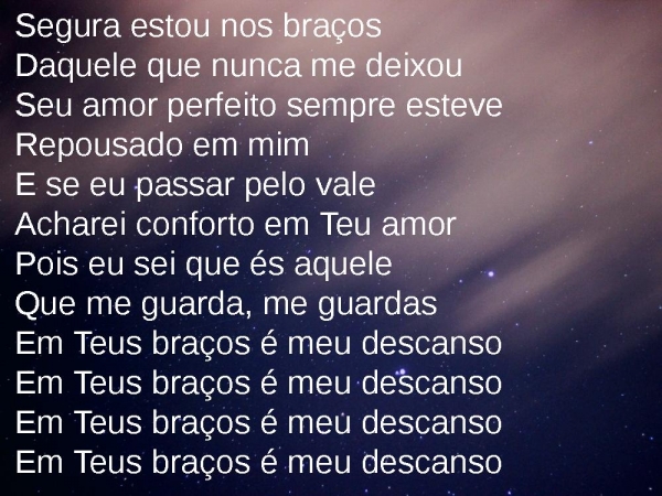 - Em Teus braços é meu descansoEm Teus braços é meu descansoEm Teus braços é meu descansoEm Teus braços é meu descanso, em Teus braçosEm Teus braços é meu descanso, meu lugar!Em Teus braços é meu descansoEm Teus braços é meu descansoEm Teus braços é meu descanso