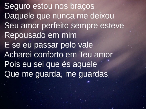 - Seguro estou nos braçosDaquele que nunca me deixouSeu amor perfeito sempre esteveRepousado em mimE se eu passar pelo valeAcharei conforto em Teu amorPois eu sei que és aqueleQue me guarda, me guardas