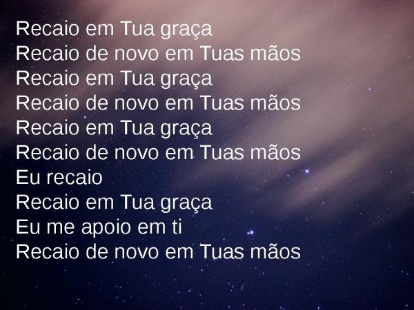 - Recaio em Tua graçaRecaio de novo em Tuas mãosRecaio em Tua graçaRecaio de novo em Tuas mãosRecaio em Tua graçaRecaio de novo em Tuas mãosEu recaioRecaio em Tua graçaEu me apoio em tiRecaio de novo em Tuas mãos