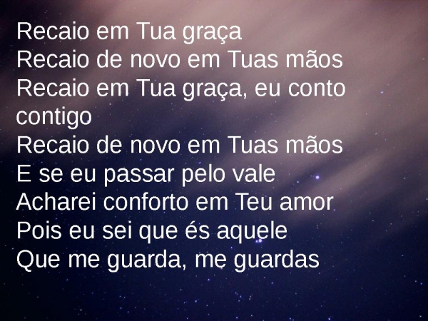 - Recaio em Tua graçaRecaio de novo em Tuas mãosRecaio em Tua graça, eu conto contigoRecaio de novo em Tuas mãosE se eu passar pelo valeAcharei conforto em Teu amorPois eu sei que és aqueleQue me guarda, me guardas