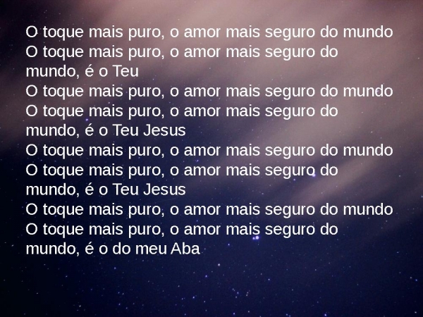 - O toque mais puro, o amor mais seguro do mundoO toque mais puro, o amor mais seguro do mundo, é o TeuO toque mais puro, o amor mais seguro do mundoO toque mais puro, o amor mais seguro do mundo, é o Teu JesusO toque mais puro, o amor mais seguro do mundoO toque mais puro, o amor mais seguro do mundo, é o Teu JesusO toque mais puro, o amor mais seguro do mundoO toque mais puro, o amor mais seguro do mundo, é o do meu Aba