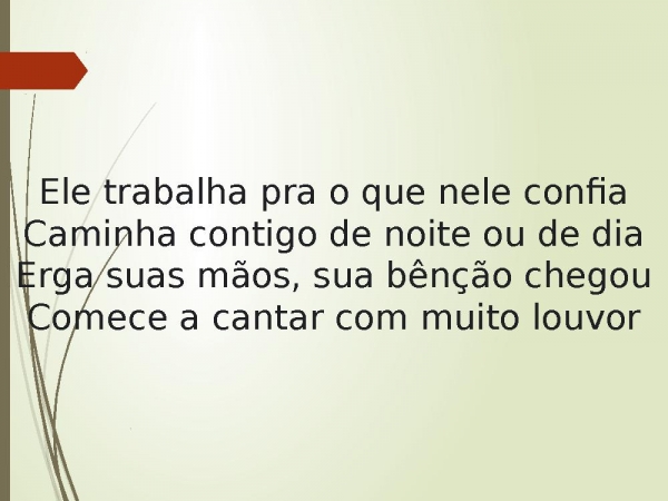 - Ele trabalha pra o que nele confiaCaminha contigo de noite ou de diaErga suas mãos, sua bênção chegouComece a cantar com muito louvor