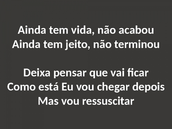 - Ainda tem vida, não acabouAinda tem jeito, não terminouDeixa pensar que vai ficarComo está Eu vou chegar depoisMas vou ressuscitar