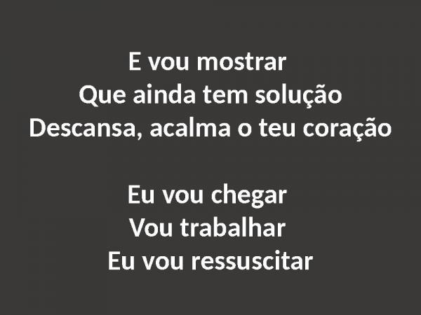 - E vou mostrar Que ainda tem soluçãoDescansa, acalma o teu coraçãoEu vou chegar Vou trabalhar Eu vou ressuscitar