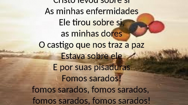- Cristo levou sobre siAs minhas enfermidadesEle tirou sobre si,as minhas doresO castigo que nos traz a pazEstava sobre eleE por suas pisadurasFomos sarados!fomos sarados, fomos sarados, fomos sarados, fomos sarados!