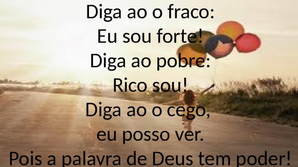 - Diga ao o fraco:Eu sou forte!Diga ao pobre:Rico sou!Diga ao o cego, eu posso ver.Pois a palavra de Deus tem poder!
