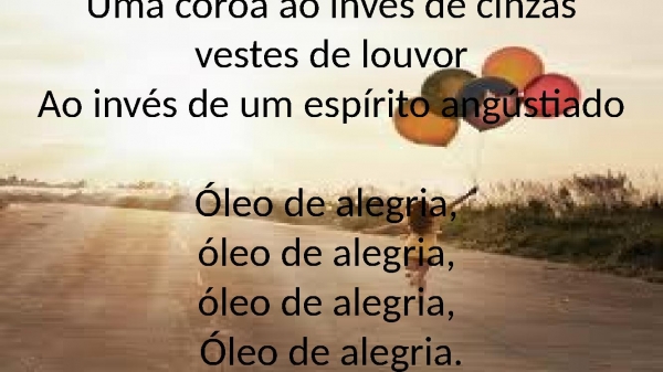 - Uma coroa ao invés de cinzasvestes de louvorAo invés de um espírito angústiadoÓleo de alegria, óleo de alegria, óleo de alegria, Óleo de alegria.