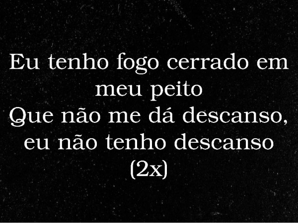 - Eu tenho fogo cerrado em meu peitoQue não me dá descanso, eu não tenho descanso(2x)