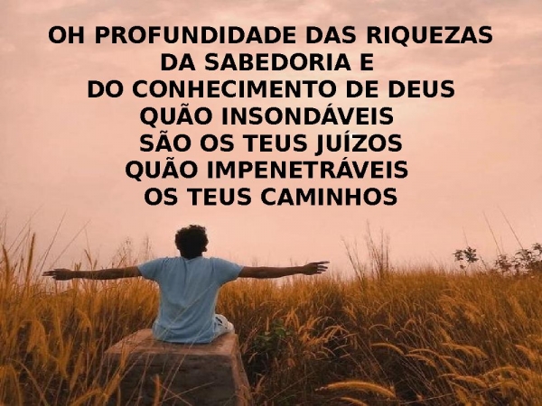 - OH PROFUNDIDADE DAS RIQUEZASDA SABEDORIA E DO CONHECIMENTO DE DEUSQUÃO INSONDÁVEIS SÃO OS TEUS JUÍZOSQUÃO IMPENETRÁVEIS OS TEUS CAMINHOS