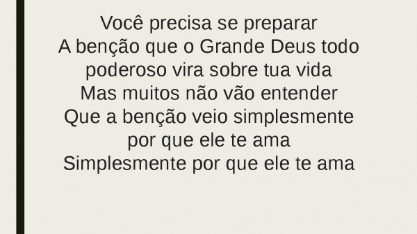 - Você precisa se prepararA benção que o Grande Deus todo poderoso vira sobre tua vidaMas muitos não vão entenderQue a benção veio simplesmente por que ele te amaSimplesmente por que ele te ama