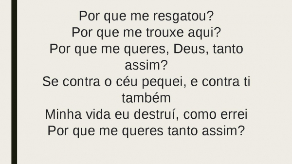 - Por que me resgatou?Por que me trouxe aqui?Por que me queres, Deus, tanto assim?Se contra o céu pequei, e contra ti tambémMinha vida eu destruí, como erreiPor que me queres tanto assim?