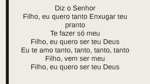 - Diz o SenhorFilho, eu quero tanto Enxugar teu prantoTe fazer só meuFilho, eu quero ser teu DeusEu te amo tanto, tanto, tanto, tantoFilho, vem ser meuFilho, eu quero ser teu Deus
