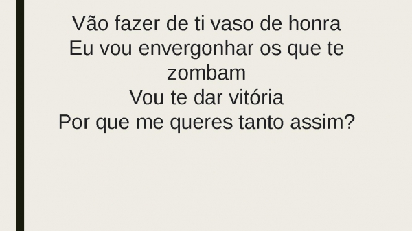 - Vão fazer de ti vaso de honraEu vou envergonhar os que te zombamVou te dar vitóriaPor que me queres tanto assim?