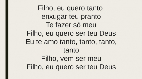 - Filho, eu quero tanto enxugar teu prantoTe fazer só meuFilho, eu quero ser teu DeusEu te amo tanto, tanto, tanto, tantoFilho, vem ser meuFilho, eu quero ser teu Deus
