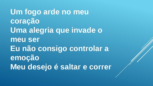 - Um fogo arde no meu coraçãoUma alegria que invade o meu serEu não consigo controlar a emoçãoMeu desejo é saltar e correr